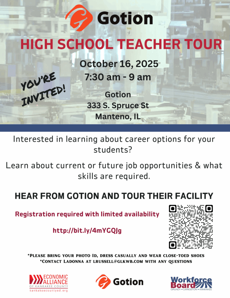 In celebration of Manufacturing Month the Economic Alliance and the Grundy Livingston Workforce Board are bringing awareness of the job opportunities available and the skills needed for manufacturing positions in our community. One event will be a tour and conversation at Gotion, an energy storage system and electric vehicle battery manufacturer in Manteno. This is set for October 16, 2025 at 7:30am.