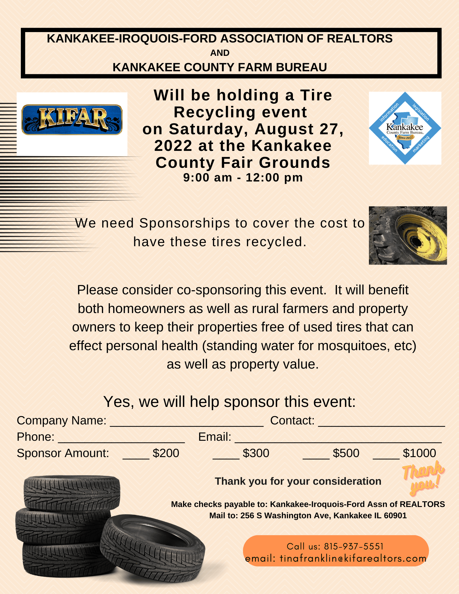 The Kankakee Iroquois Ford Association of Realtors is partnering with the Kankakee County Farm Bureau to host a tire recycling event Saturday, August 27, 2022 at the Kankakee County Fairgrounds. The event will run from 9:00 am- 12:00 Noon.