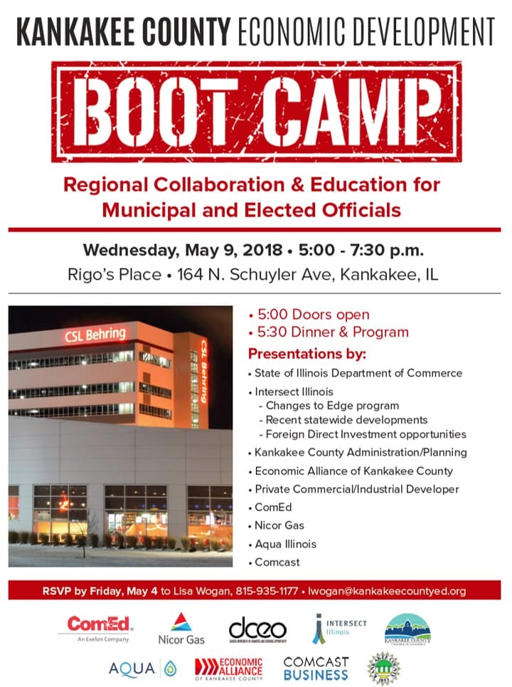 Municipal and community leaders are invited to join the Alliance, ComEd and Nicor for an informative Economic Development Boot Camp on Wednesday, May 9, 2018.