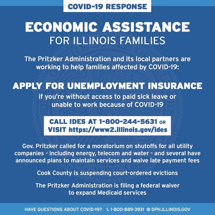 If you are without access to paid sick leave or unable to work because of COVID-19, phone the Illinois Department of Employment Security (IDES) at 800-244-5631 or visit www2.illinois.gov/ides.